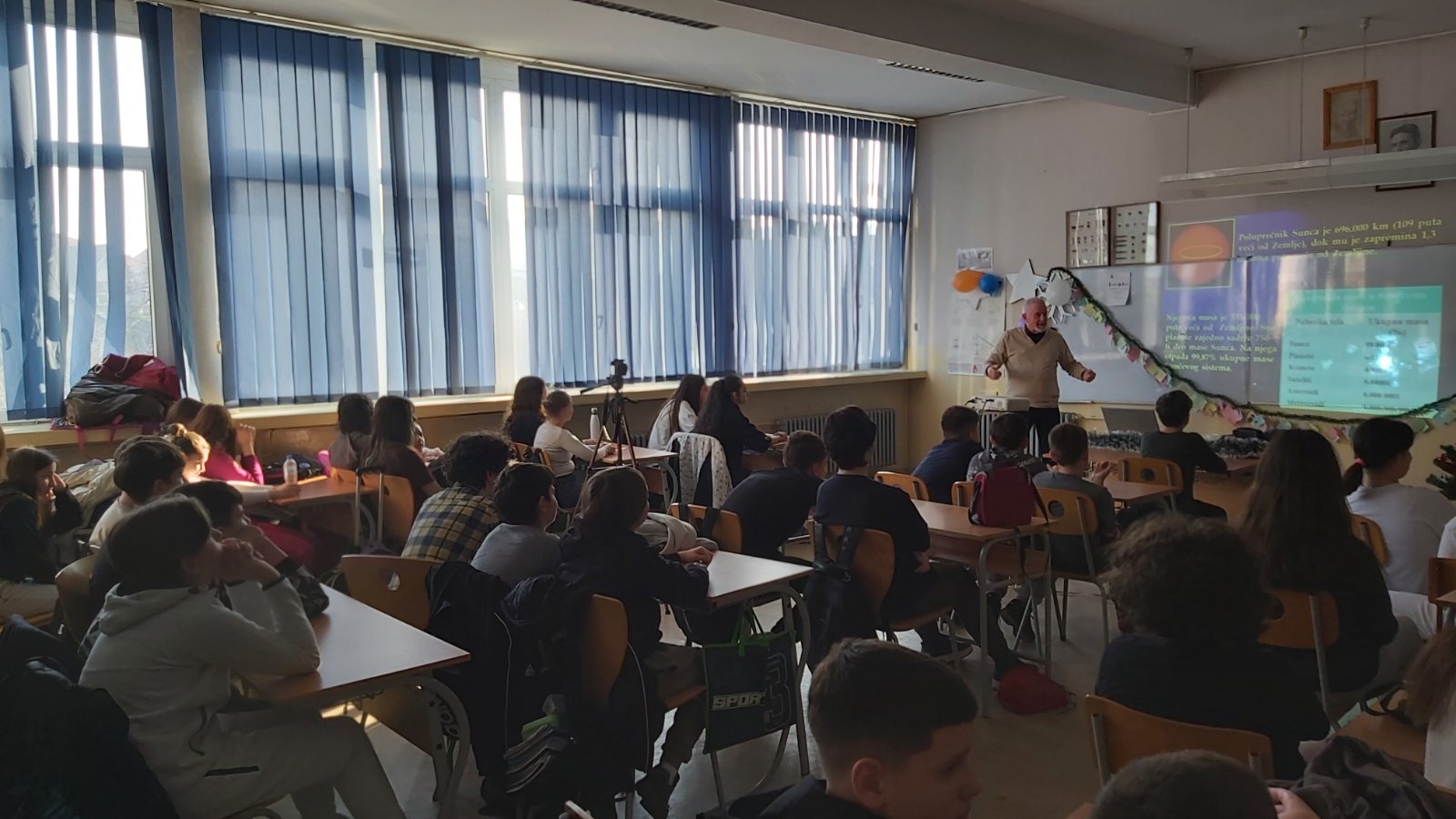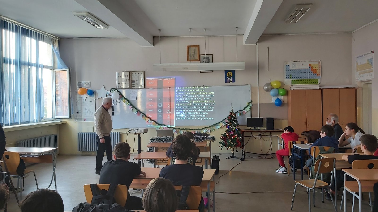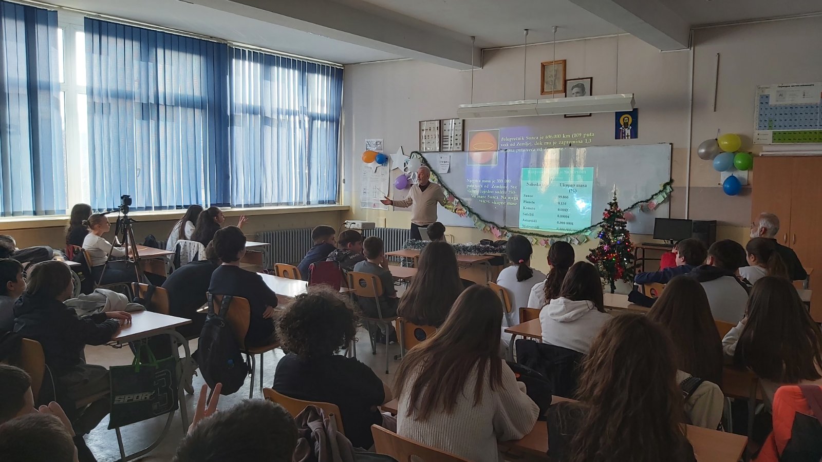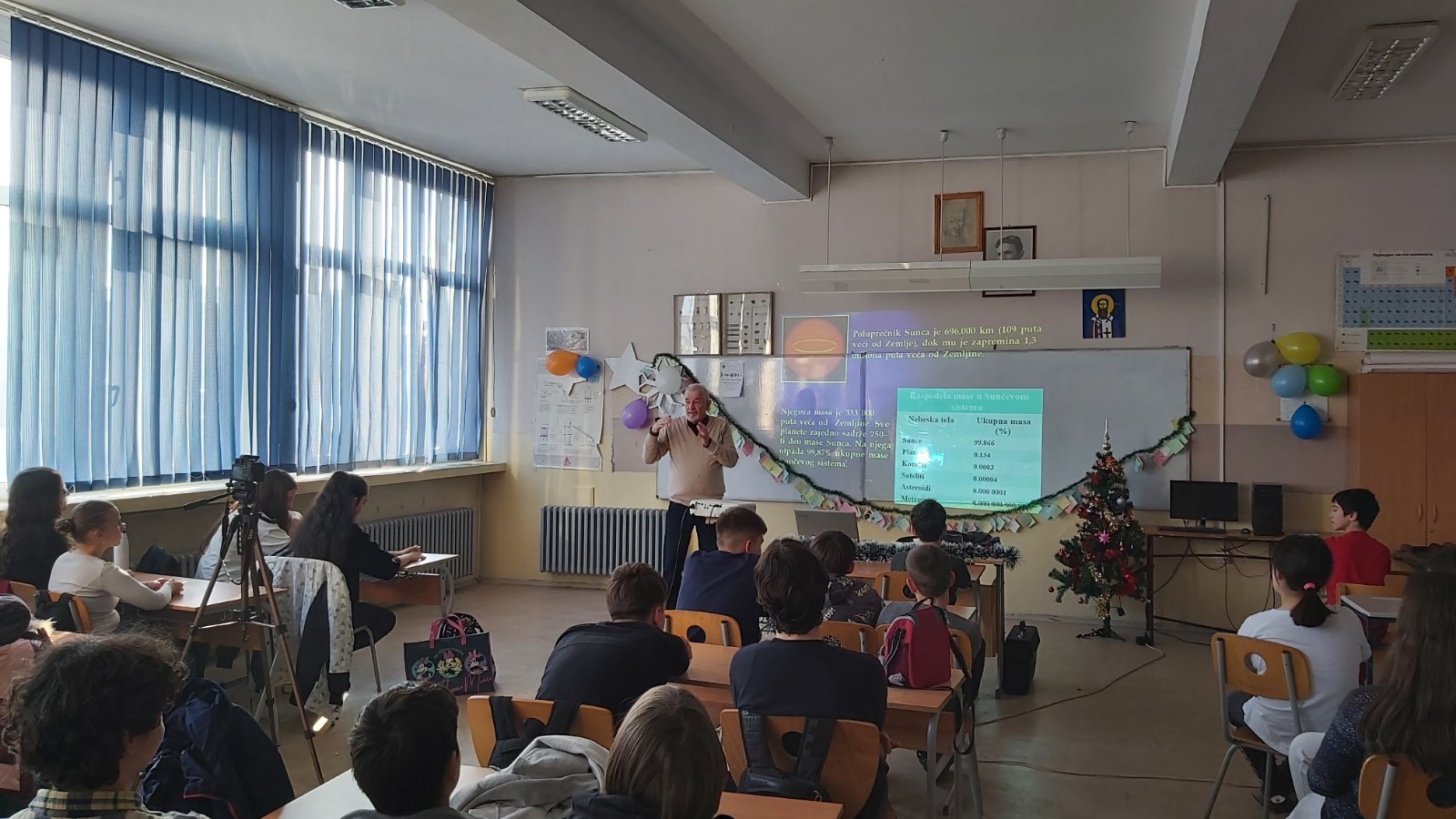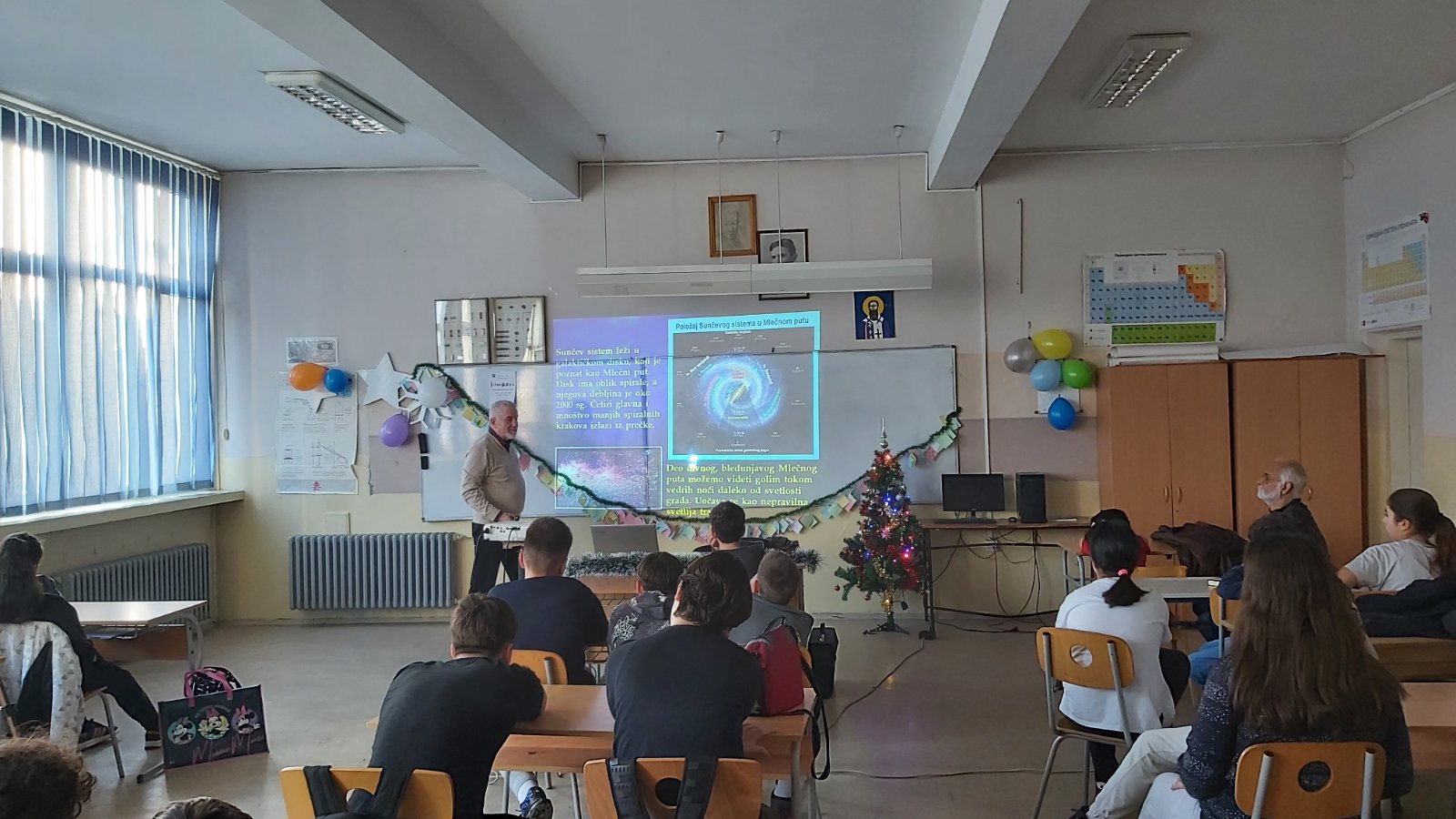 У понедељак 22. 12. 2025. године, у кабинету физике, професор ПМФ-а у Нишу Драган Гајић одржао је ученицима старијих разреда предавање „Лична карта Сунчевог система“.